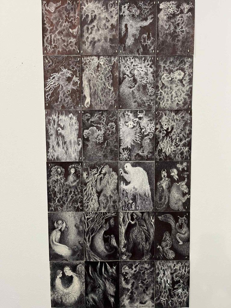 “ Многу ми е драго што Јелена ме покани да напишам текст за нејзината прва самостојна изложба на цртежи СИНИЛО, која покрај големиот квалитет, носи и силна потврда за постоењето на едно посебно творечко јадро во секој човек на планетата. Имено, цртежот што настанува од таквото јадро го нареков „длабински цртеж“. Длабинскиот цртеж опфаќа едноставен систем на цртачки техники кои се применуваат во однос на моменталните асоцијации, психосоматските реакции и миговите на свесни увиди на поединецот додека црта. Мислам дека процесот на длабински цртеж е најблиску до изворот на природните психички механизми кои создаваат соништа, визии, фантазии и халуцинации. Тој ги опфаќа импулсите од несвесните визуелни содржини на психата правејќи ги корисни за поединецот така што го фокусира на неговите реални творечки потенцијали и извори на енергија. Длабинскиот цртеж на тој начин е пат по кој поединецот ја гради својата слобода низ постојано ослободување, чекор по чекор, паралелно развивајќи ја и цртачката вештина.”